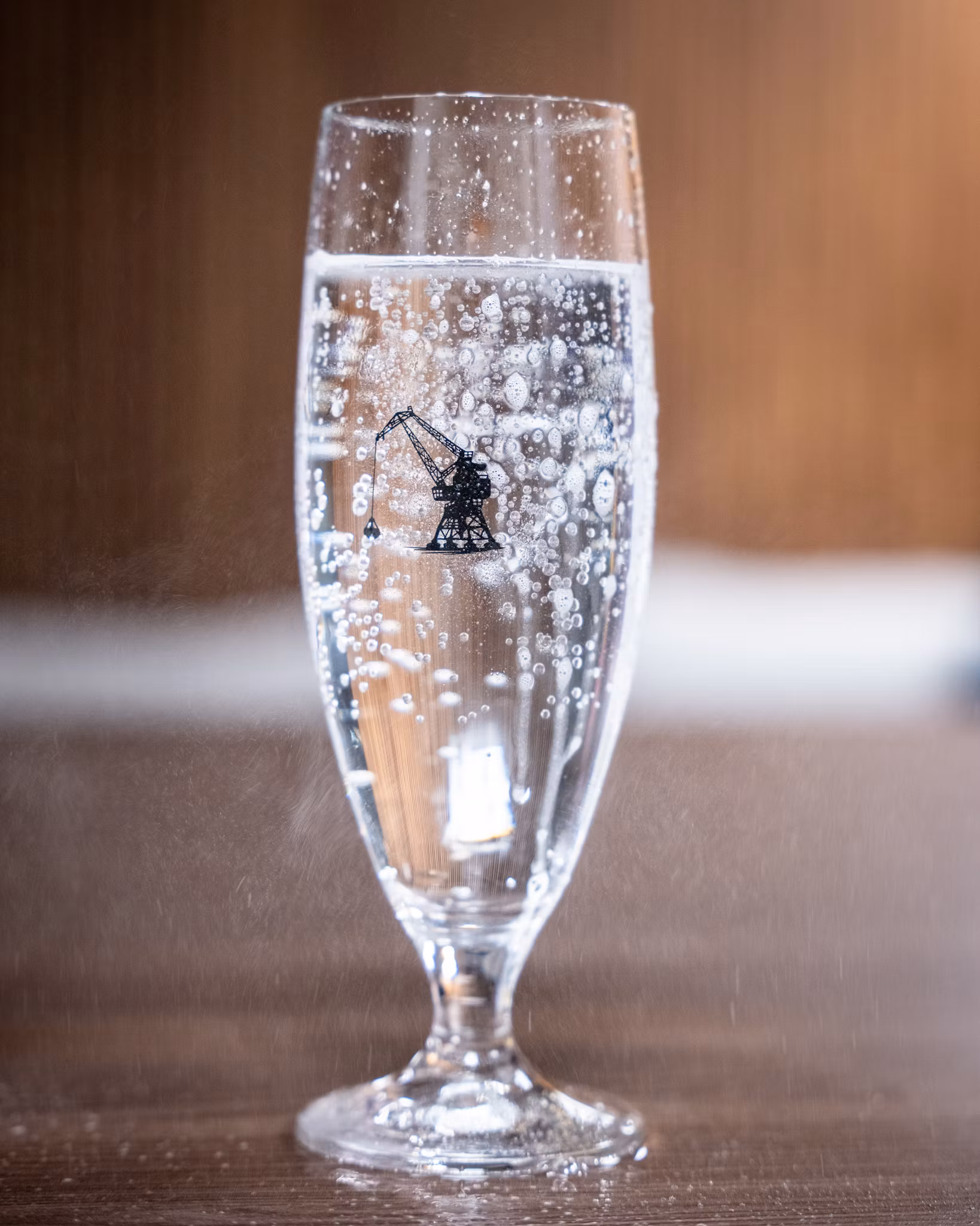 Stilrent glas med tryck av kranen och isbrytaren, som kännetecknar Luleå stad.