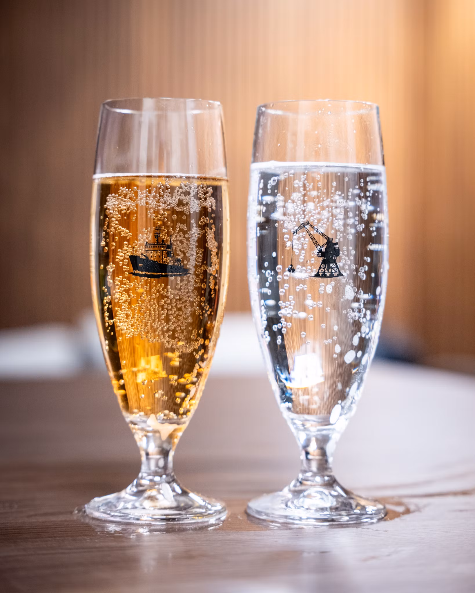 Stilrent glas med tryck av kranen och isbrytaren, som kännetecknar Luleå stad.